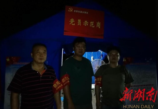7月12日凌晨,在南津港电排站附近,“党员示范岗”在这个夜间显得格外明亮,由钢管和棚布搭建的防汛帐篷“驻守”在大堤上。
