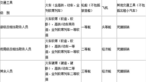 第七条 出差人员应当按规定等级乘坐交通工具。乘坐交通工具的等级见下表: