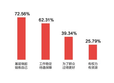 样本情况:全国31个省区市的605名基层干部、4284名群众参与了调查。受访的基层干部中,从事基层工作不足5年的占27.77%、5到10年的42.64%、11到20年的20.83%、20年以上的8.76%。